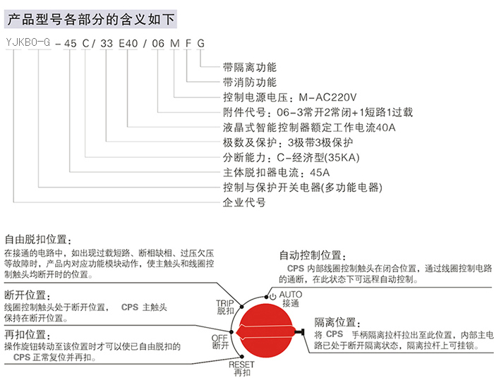 YJKBO-G隔离型即“控制与保护开关电器”是低压电器中的新型产品,作为新的大类产品,其产品类别代号为“CPS”,是英文“Control and Protective Switching Device”的缩写。